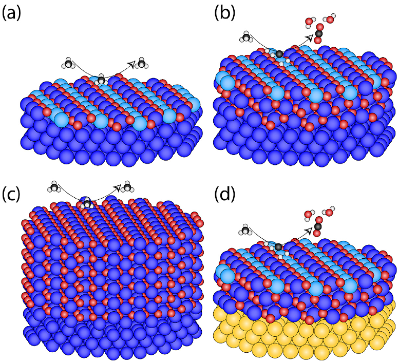 This work was a collaborative project between Johan Gustafson in Lund as part of Helen Edström's PhD thesis, and Per-Anders Carlsson. We prepared thin films of palladium covered by gold on a sapphire support. The idea was to pull the Pd out in an oxidizing environment and monitoring the process in-situ with surface X-ray diffraction (at beamline P21, Petra III). Depending on the amount of Pd the hope was to stabilize a specific surface orientation of PdO that is active for the catalytic oxidation of methane under the studied conditions. The article summarizes our findings from those experiments.